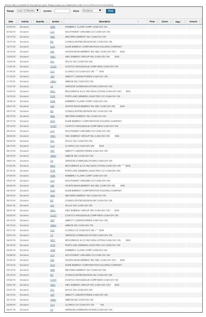 Un vistazo rápido me muestra que recibo dividendos cada mes, completamente por accidente. Cuando construí esta cartera de dividendos, mi objetivo era crear una cartera de dividendos de crecimiento . No estaba tratando de obtener cheques mensuales. ¡Pero ocurren accidentes felices!