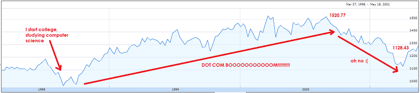 El boom de las puntocom no me quemó personalmente, pero vi las secuelas. Vi a mis amigos, que dejaron la escuela para trabajar en nuevas empresas, regresar. Escuché historias de ofertas de trabajo rescindidas. Vi el tanque del mercado de valores como un loco en un momento en que acababa de invertir una cantidad muy pequeña en una cuenta Roth IRA.