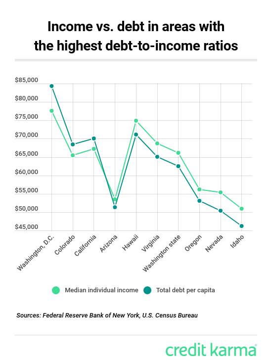 | Los residentes de Washington, DC tienen la relación deuda-ingresos más alta con 1.09 , lo que significa que en general las personas en DC tienen un 9% más de deuda de la que pueden cubrir sus ingresos. Esta área también tiene la deuda total más alta per cápita con $ 84,380, según el Banco de la Reserva Federal de Nueva York. |