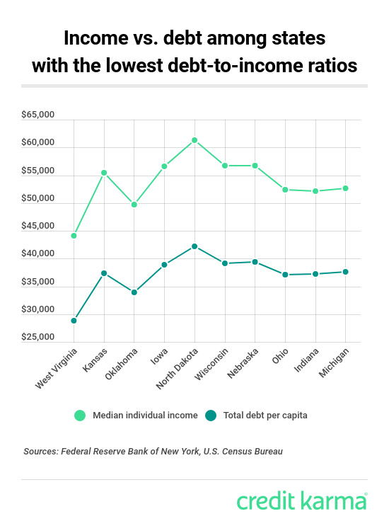 | Virginia Occidental tiene la relación deuda-ingresos más baja, 0,65 , lo que significa que, en general, los habitantes de Virginia Occidental ganan aproximadamente un 35% más de dinero de lo que deben. Este estado también tiene la menor deuda total per cápita con $ 28,790, según el Banco de la Reserva Federal de Nueva York. |