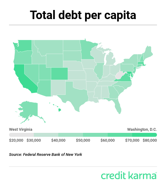 La deuda total per cápita en los EE. UU. Fue de $ 48,800 a fines de 2017, según el Banco de la Reserva Federal de Nueva York. El estado o la región donde la gente tiene más deudas es Washington, DC, mientras que el estado con la deuda más baja es Virginia Occidental.