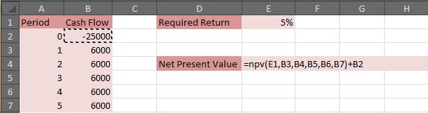 | Valor actual neto (VPN) | $ 6,000 x ((1- (1.05) -5) /0.05) - $ 25,000 | = $ 976.86 |